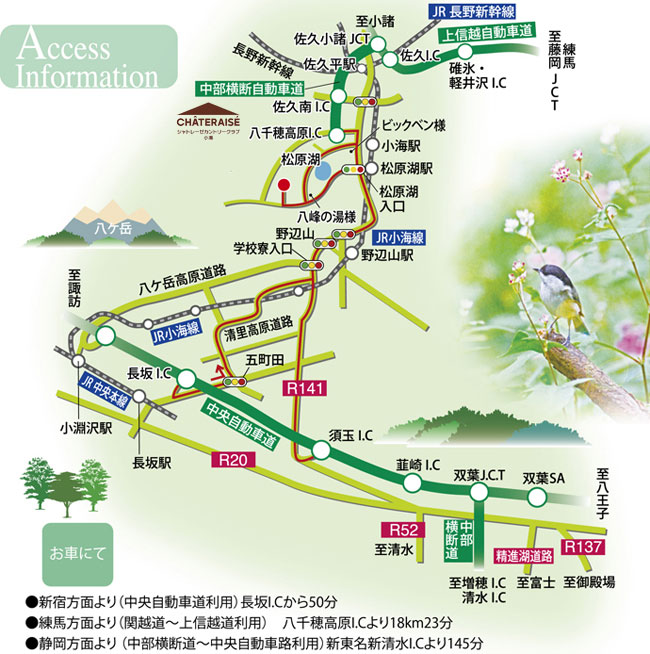 長坂I.C→清里高原道路・国道141号〈野辺山経由〉41km(50分)→シャトレーゼカントリークラブ小海