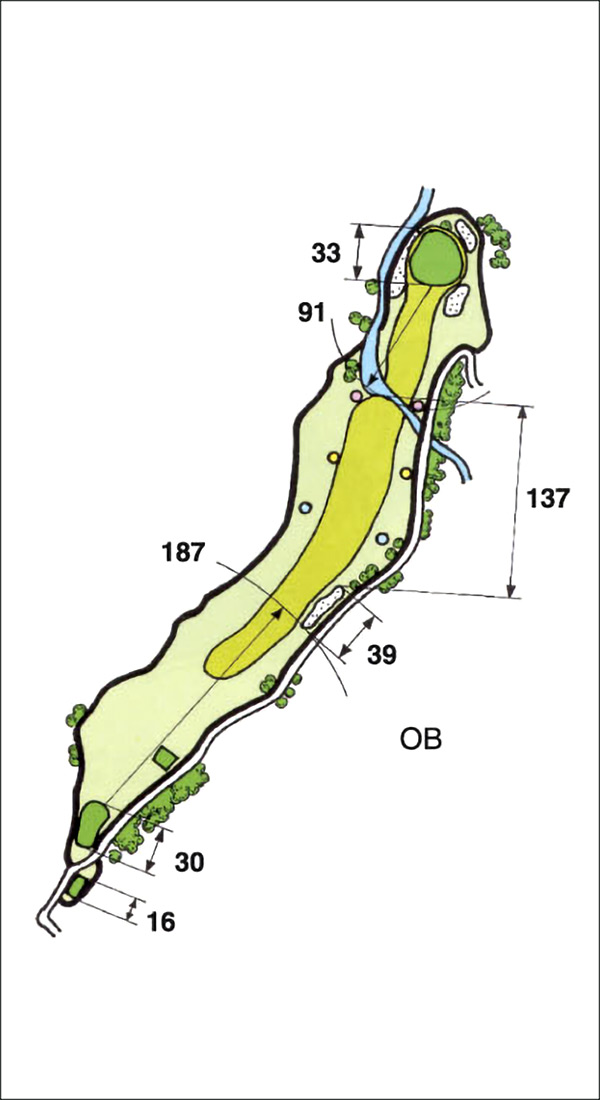 右OBに注意。左の窪地に入ったら無理せずフェアウェイに出した方が無難。