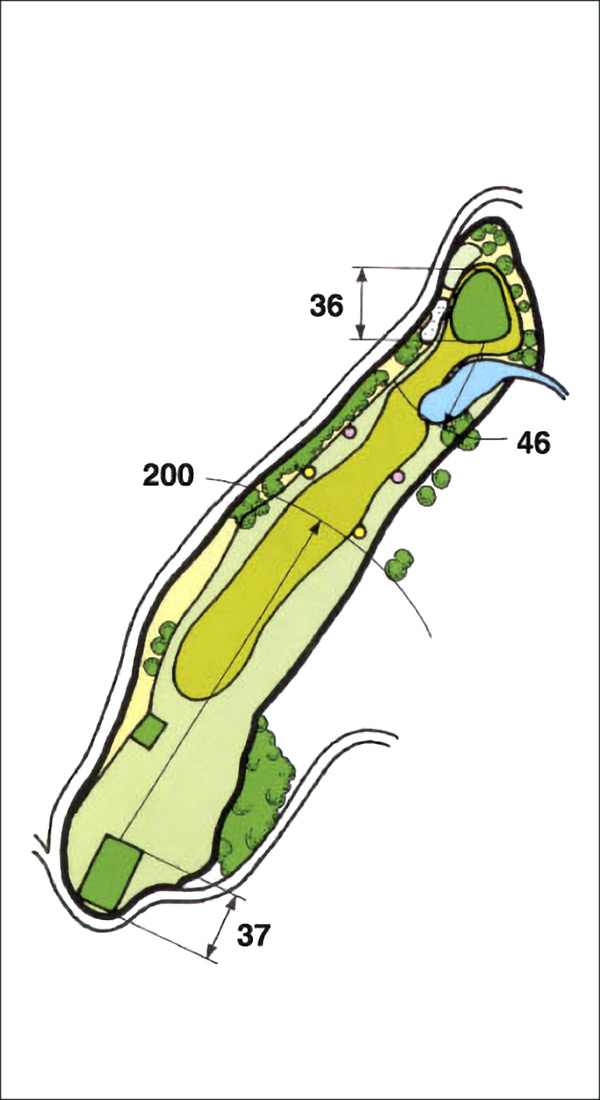 ティショットは右OBに注意が必要だが、全体的に広いのでそれほど意識しなくても良い。それよりもグリーン手前の池が曲者。要注意!