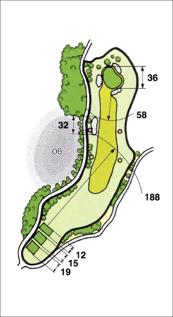 飛ばし屋は右傾斜までティショットが行きやすく、セカンドショットでグリーンが狙いにくくなる。左OBも近いのでティショットは無理せずに。