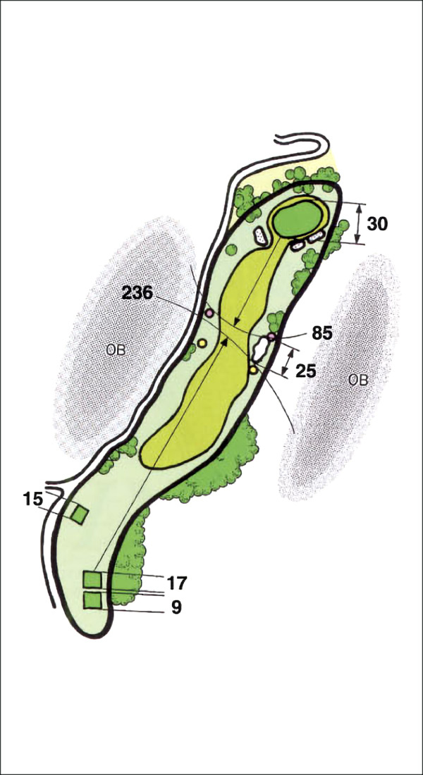 ティショットは左OBに注意。セカンド以降は打ち下ろしのため、距離感が難しい。 グリーンも横に2段グリーンのためカップ位置を要確認。