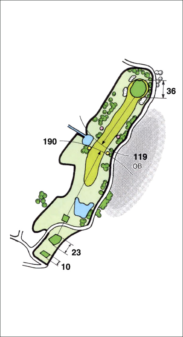 右OBに注意だが、左の池もプレッシャーになる。 ティショットの力みは禁物。